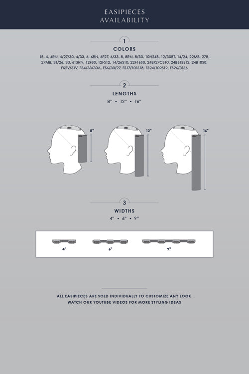 Clip-in hair volumizer that adds subtle, balancing volume to complement any hair topper for a fuller look. easiPieces are designed with a slim polyrethane base that lays flat against the head making them invisible to the eye. easiPieces are available in 8", 12" and 16" lengths on 4", 6" and 9" width bases, and are sold individually to customize any look.